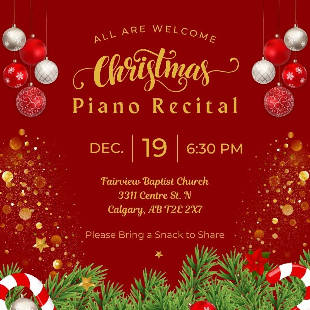 Join us on December 19 at 6:30 PM for Fairview’s Christmas Recital. Enjoy classic Christmas songs performed by members of the Fairview Family and their children. Following the recital, there will be a short time for food, refreshments, and fellowship. Please bring a snack to share!