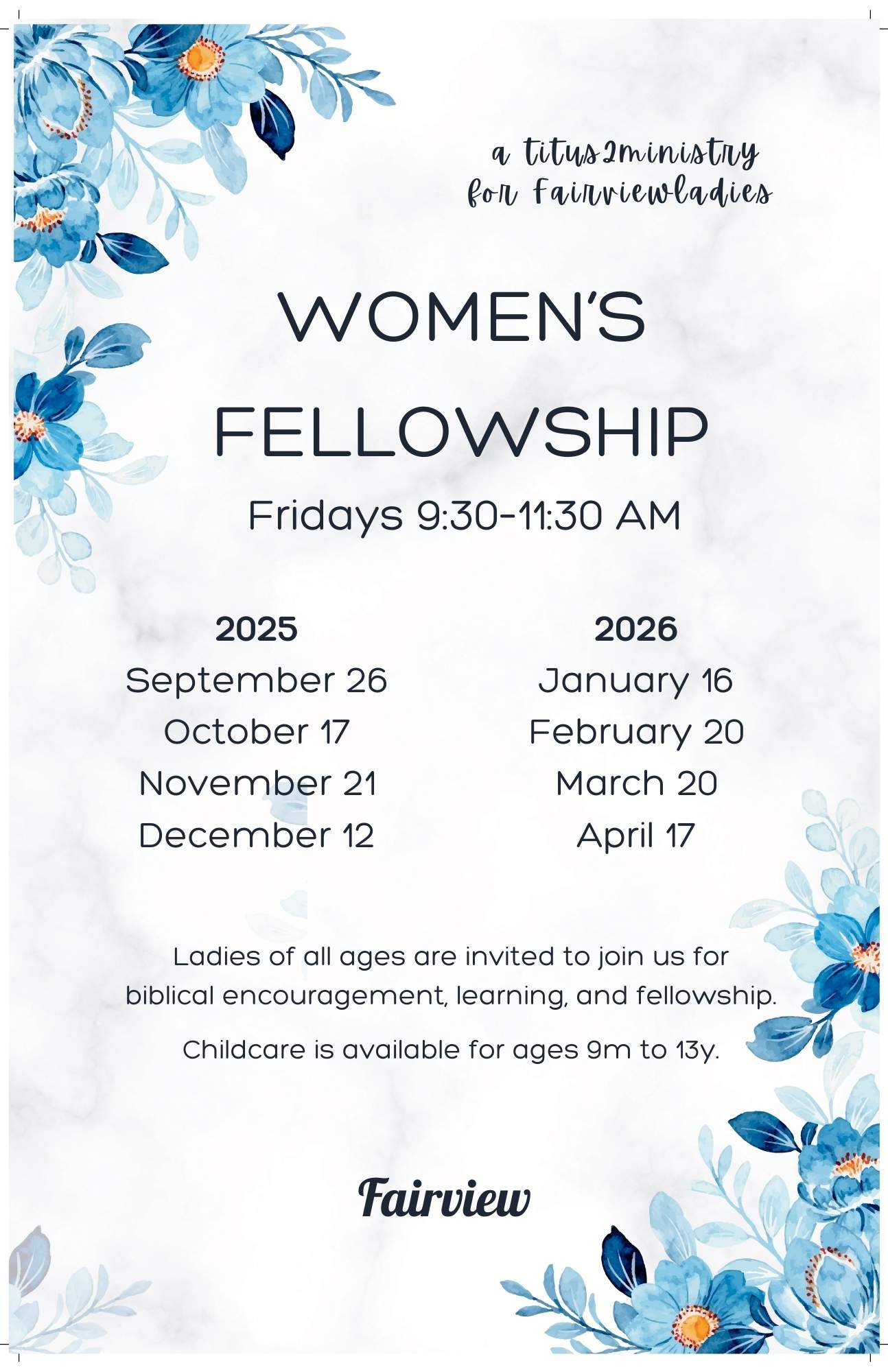 Whether you are new to our fellowship or come with years of experience, ladies of all ages at Fairview are invited to join for a morning of biblical encouragement, learning, and fellowship. Childcare available for children 9mo -12yrs.